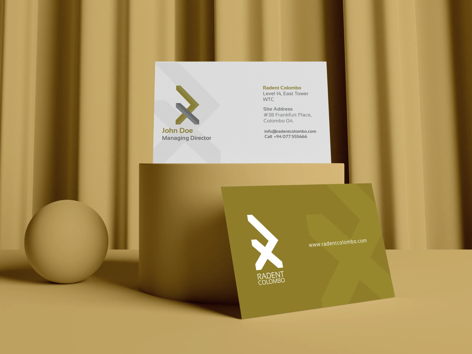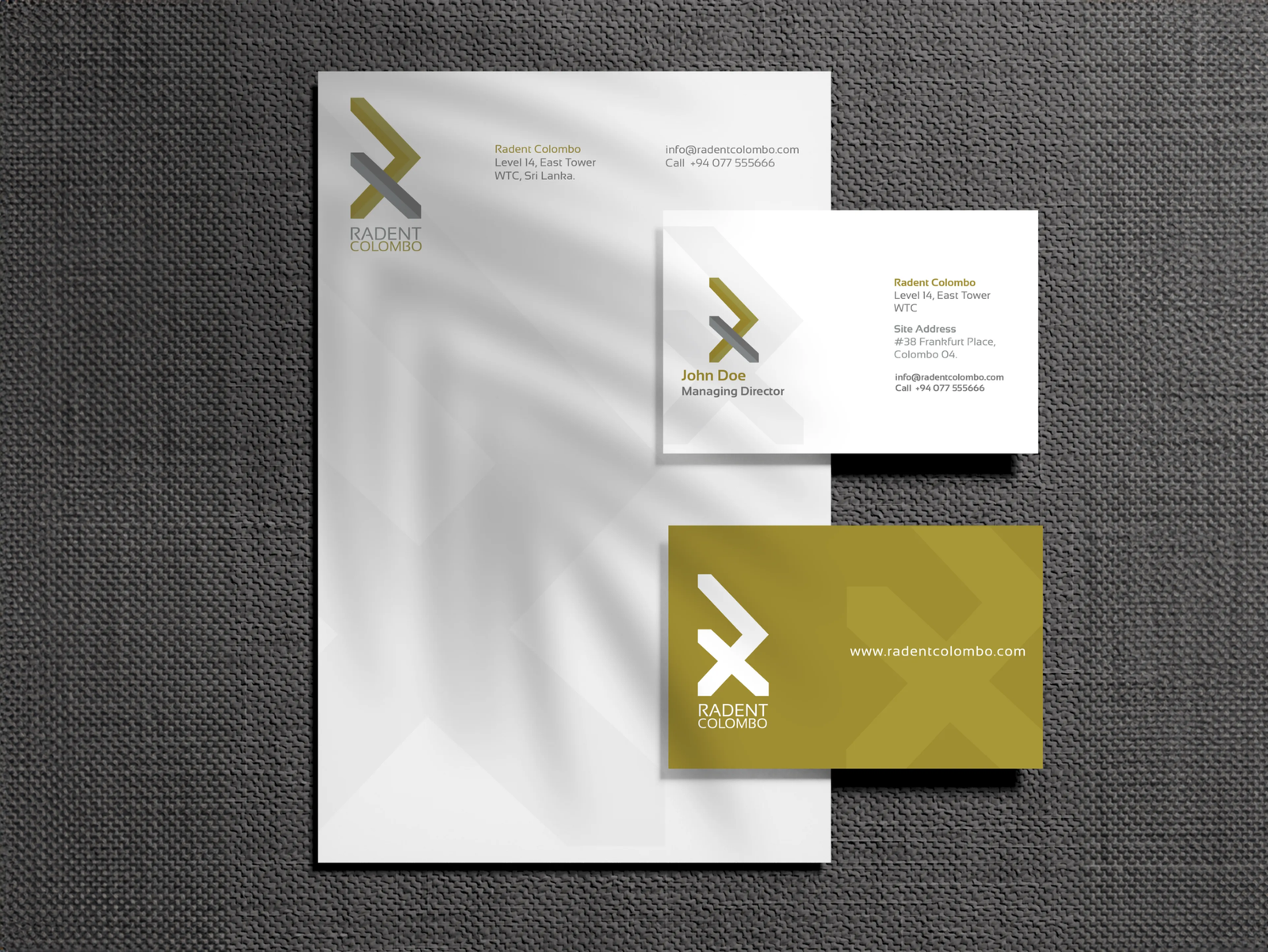 Design Mixy developed a sophisticated color palette reflecting both Colombo's tropical vibrancy and the premium nature of Radent's developments. The primary palette incorporated deep, authoritative tones paired with metallic accents communicating luxury and quality construction. Supporting colors created visual warmth while maintaining corporate professionalism across diverse applications.